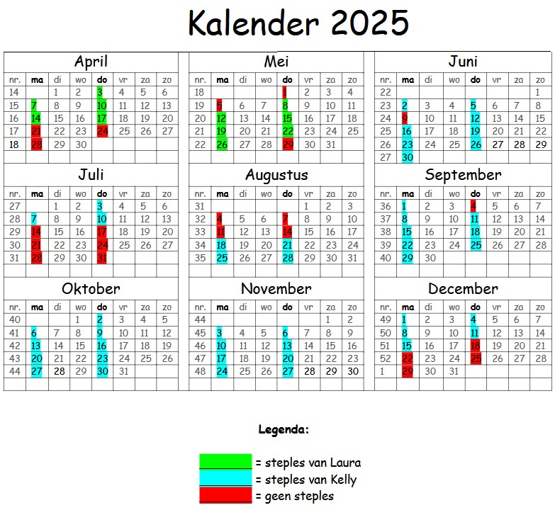 Daaronder ziet u de kalender van 2025 met hierop een planning wanneer de lessen wel/niet doorgaan.